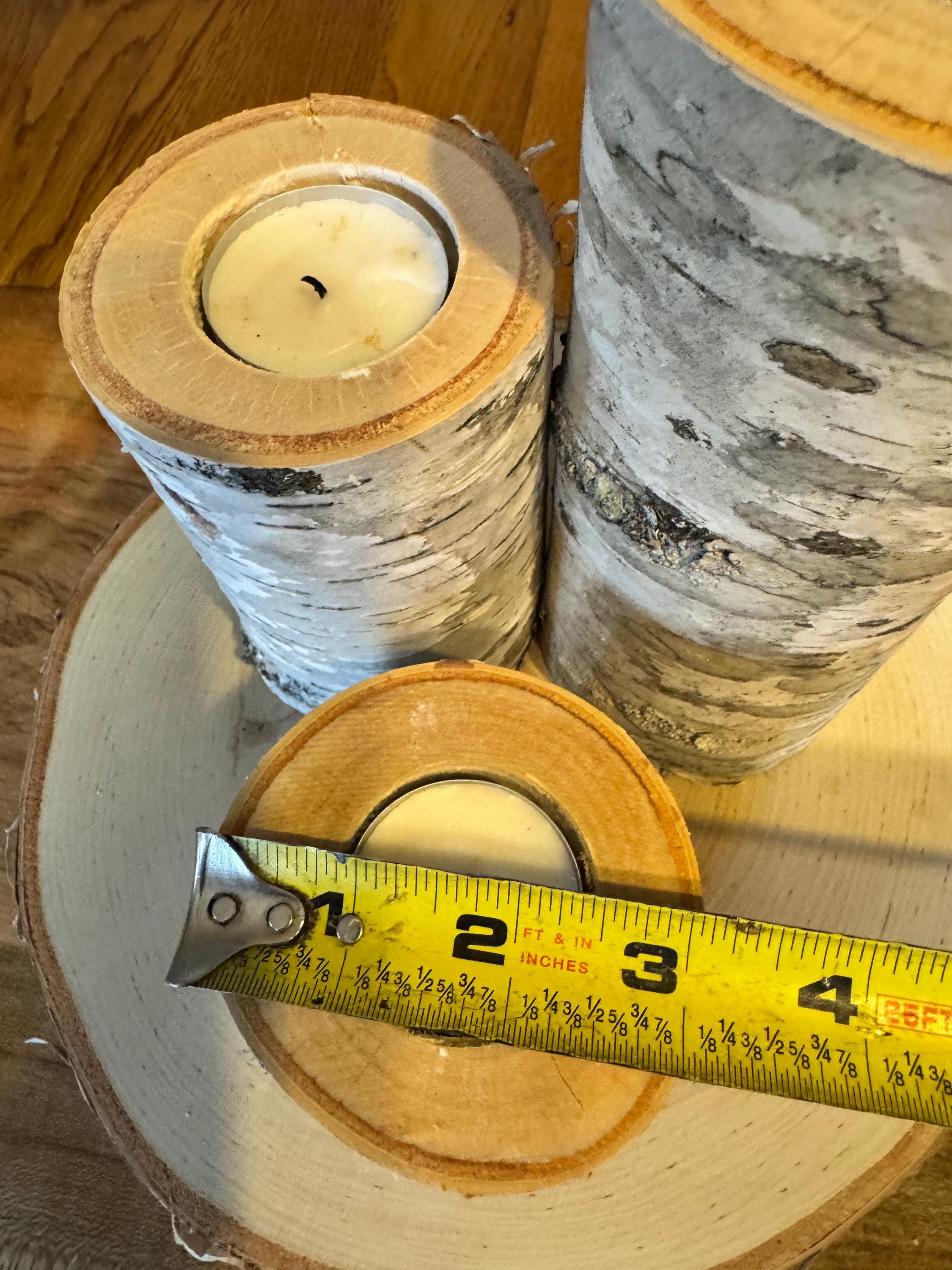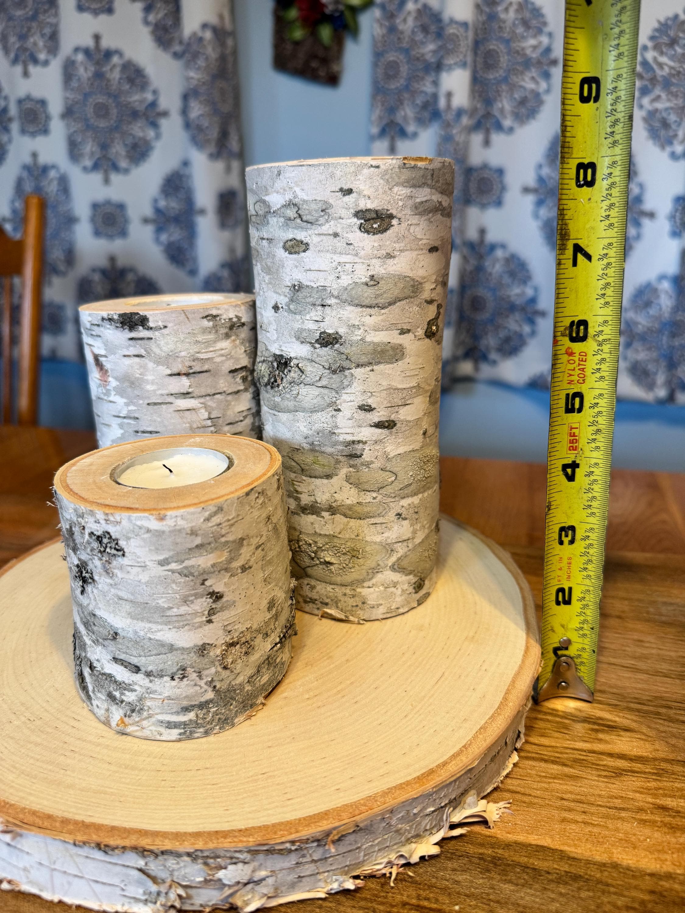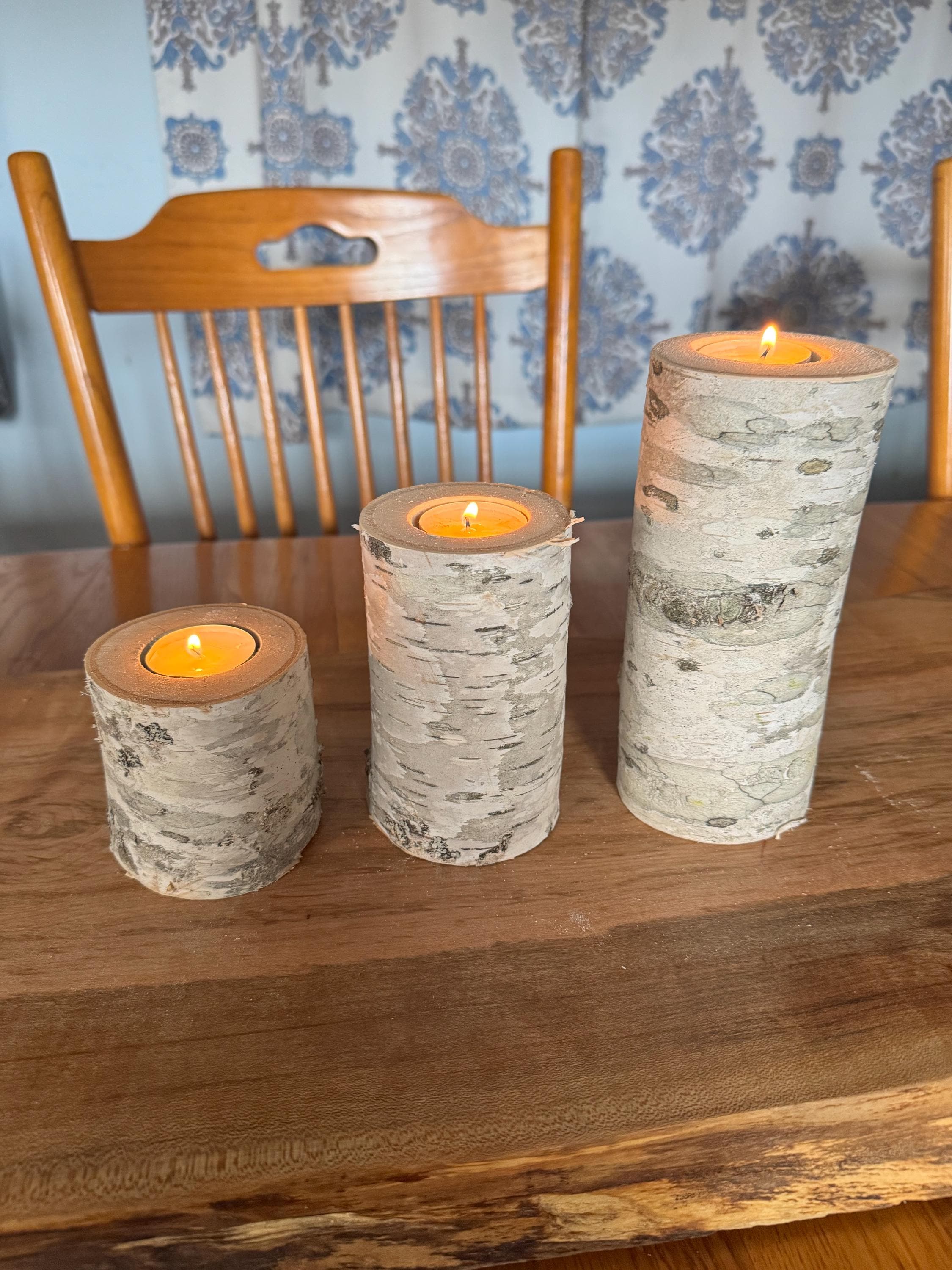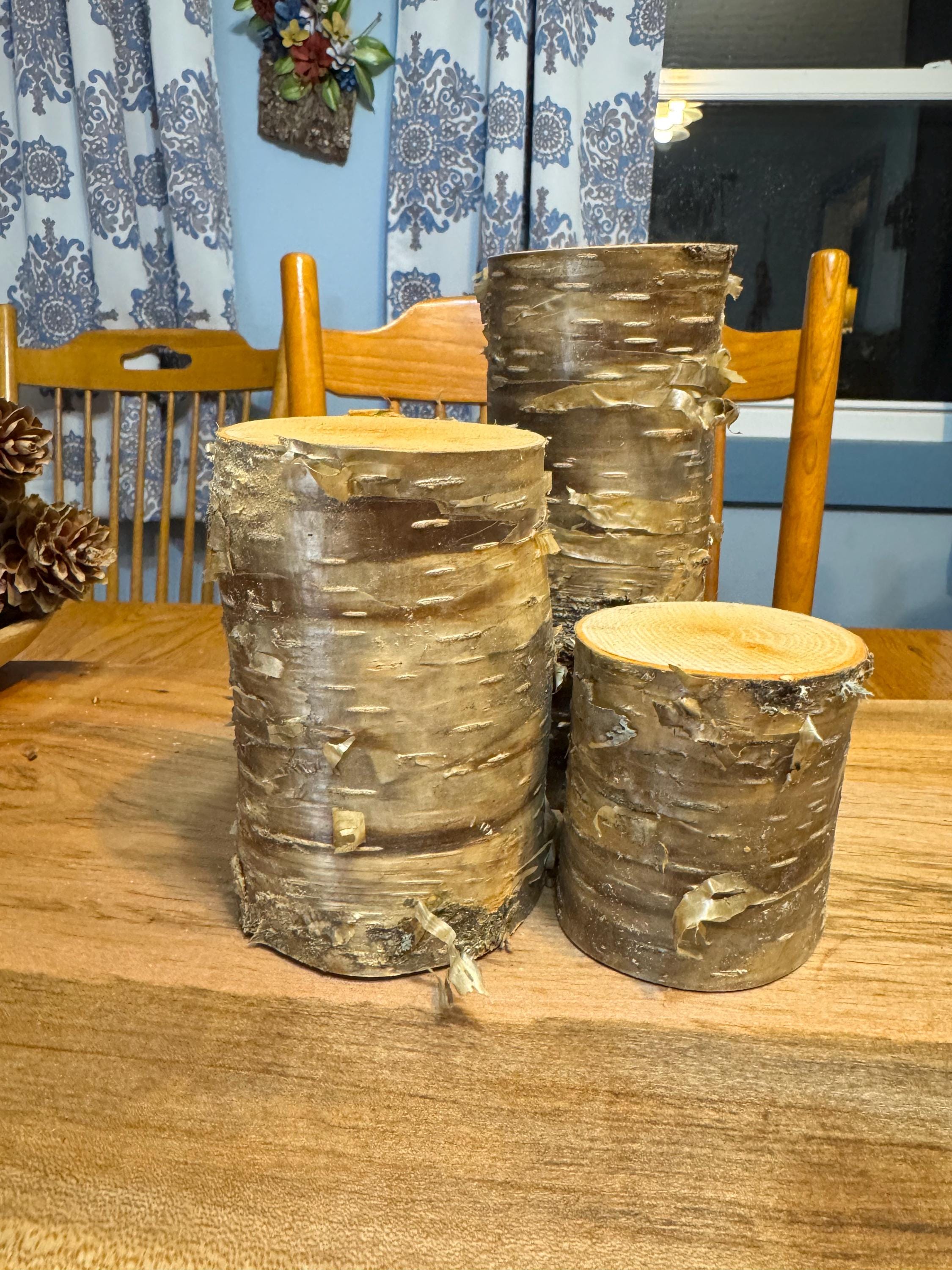 Each set includes 3 logs(3”,5”,and a 7” in length x3" wide) drilled for Tea light candles. An optional base 5/8" x 8"-9" wide can be purchased at a reduced price. The bark is brushed clean and trimmed around fire areas for safety. Expect natural variation in bark texture and color—silver, white, or paper birch—depending on what the forest offers.