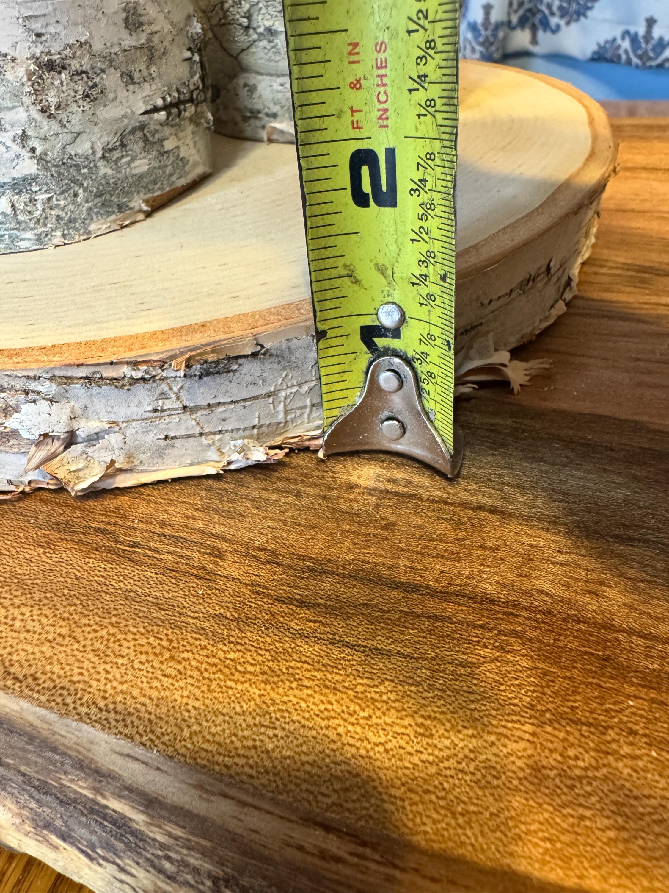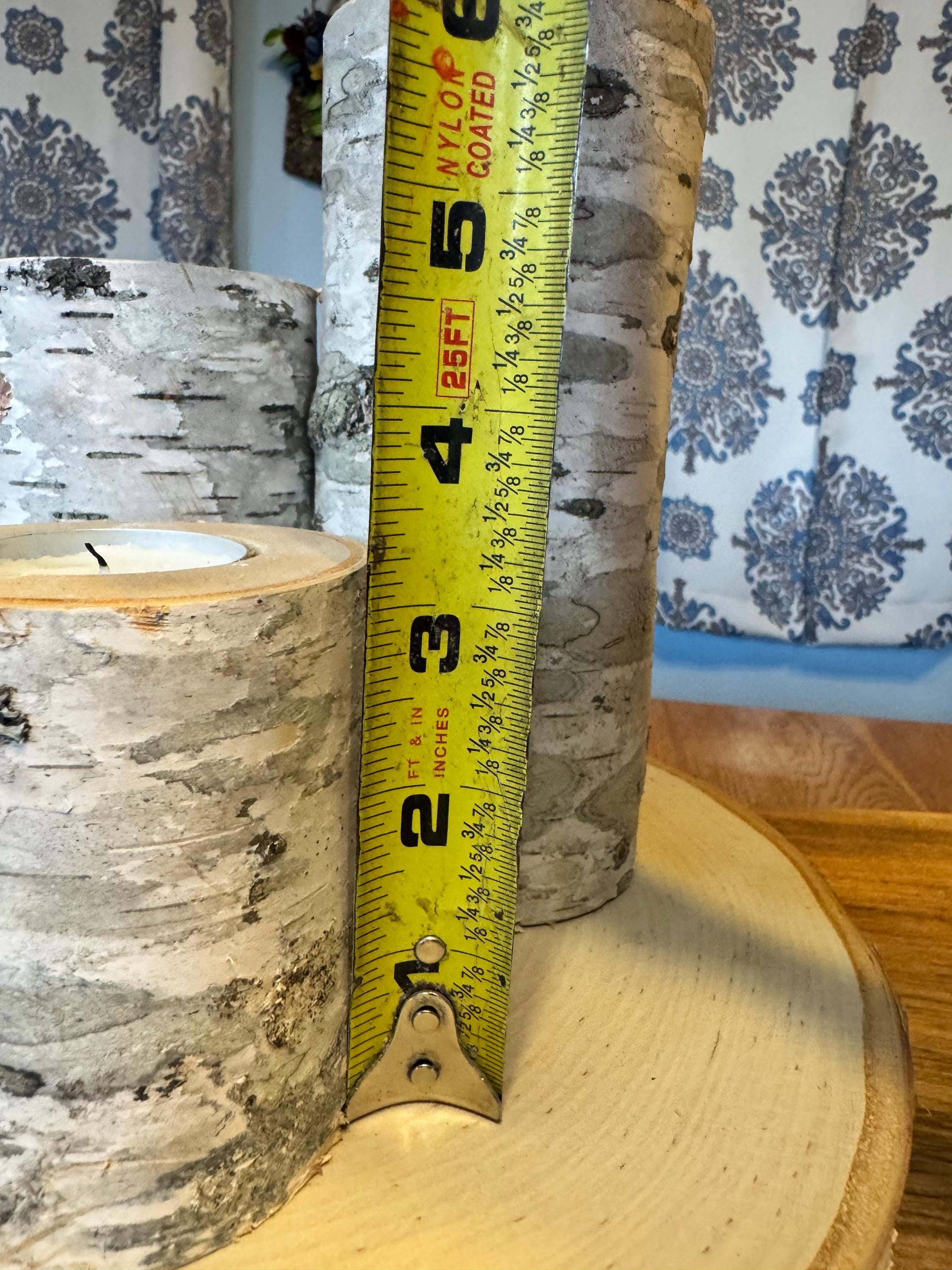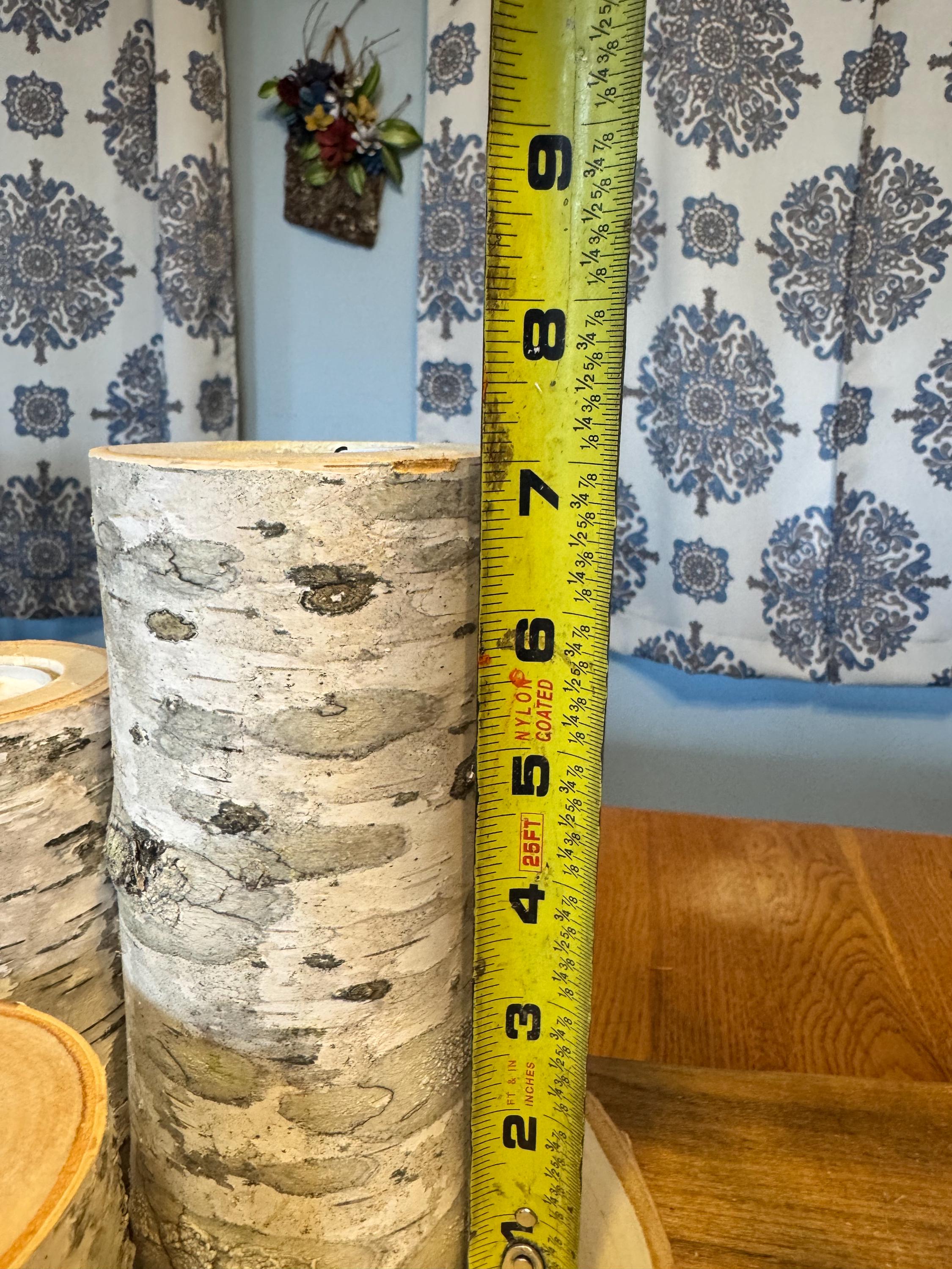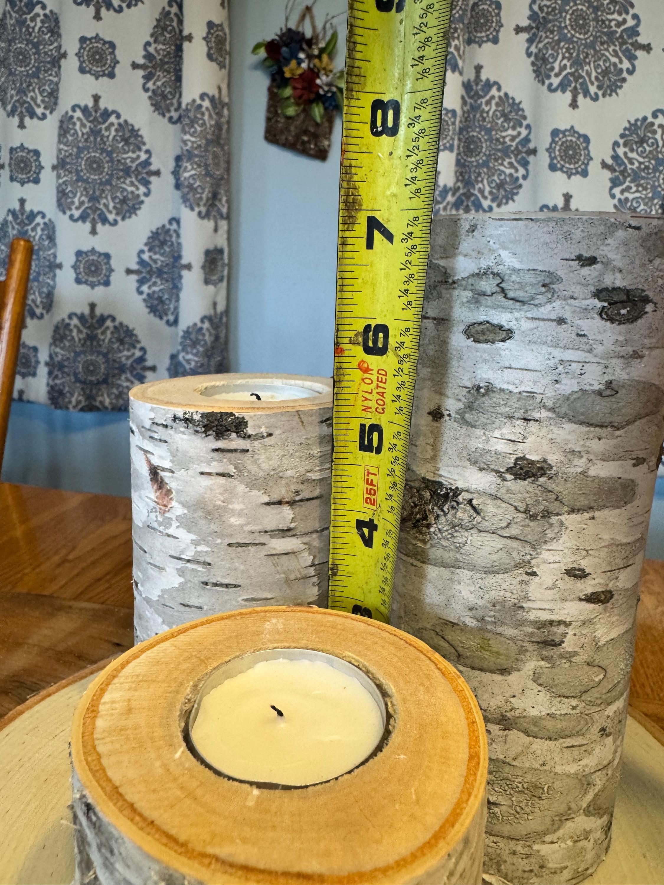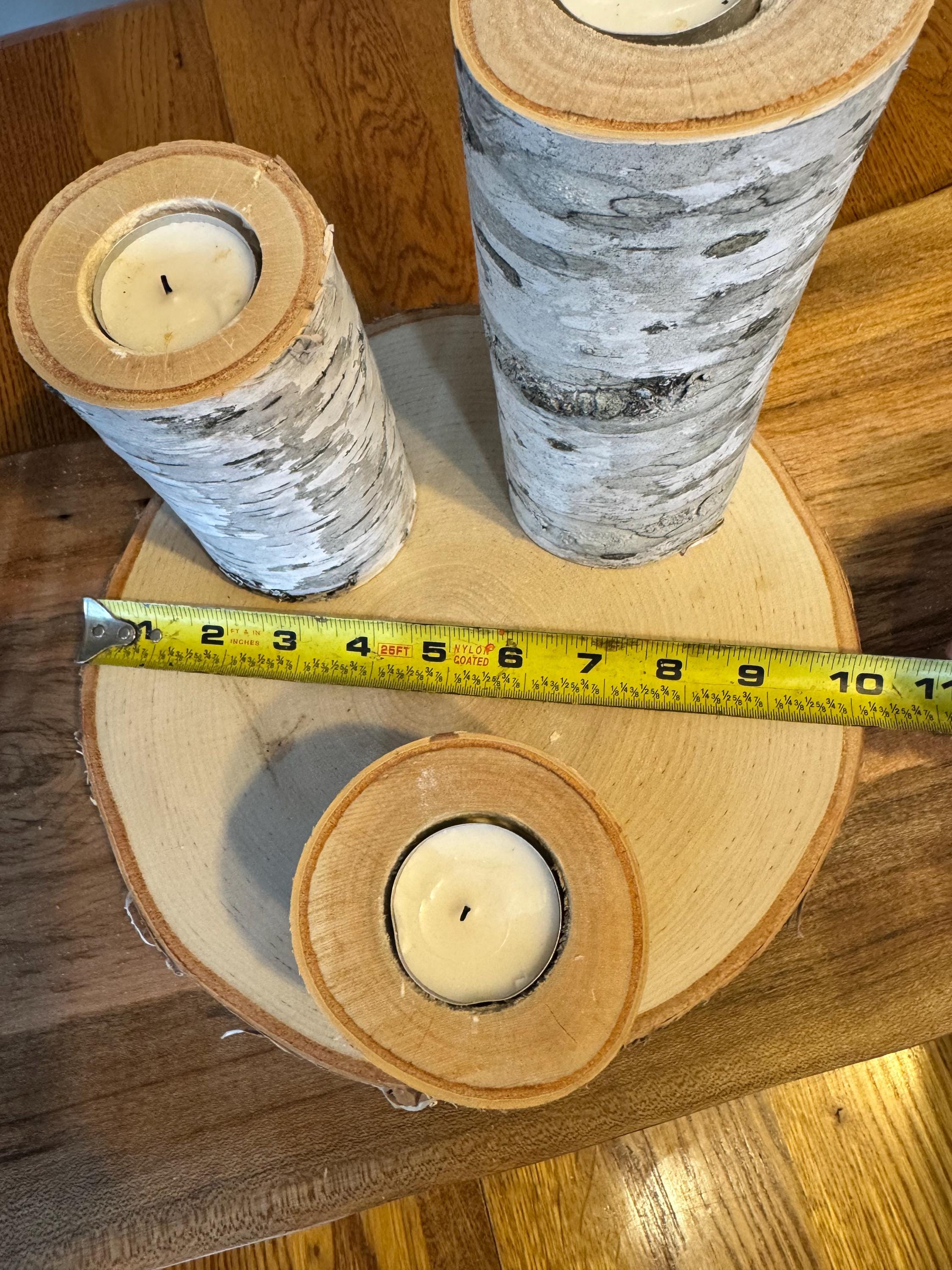 Each set includes 3 logs(3”,5”,and a 7” in length x3" wide) drilled for Tea light candles. An optional base 5/8" x 8"-9" wide can be purchased at a reduced price. The bark is brushed clean and trimmed around fire areas for safety. Expect natural variation in bark texture and color—silver, white, or paper birch—depending on what the forest offers.