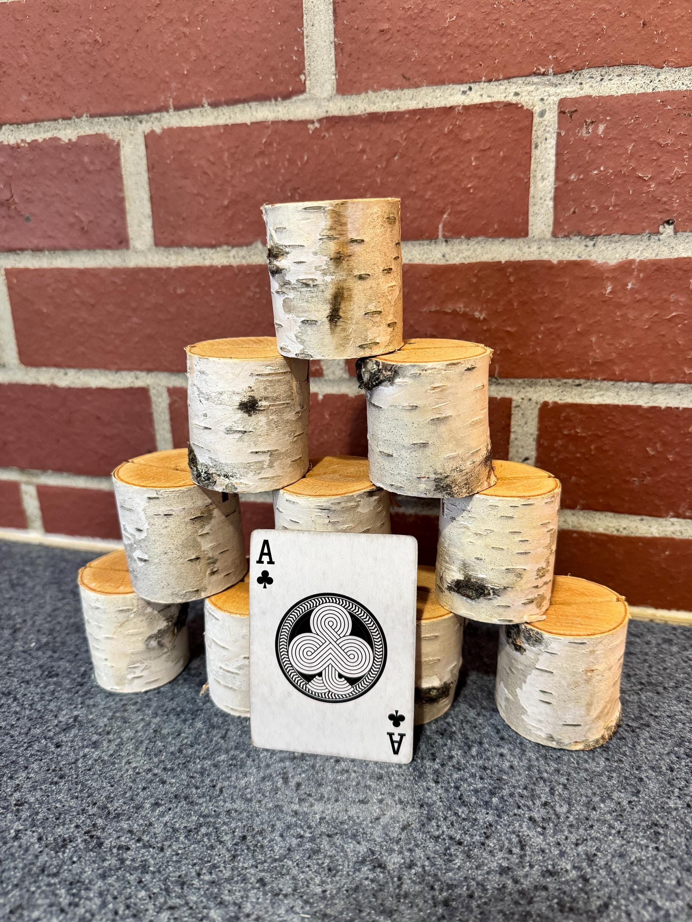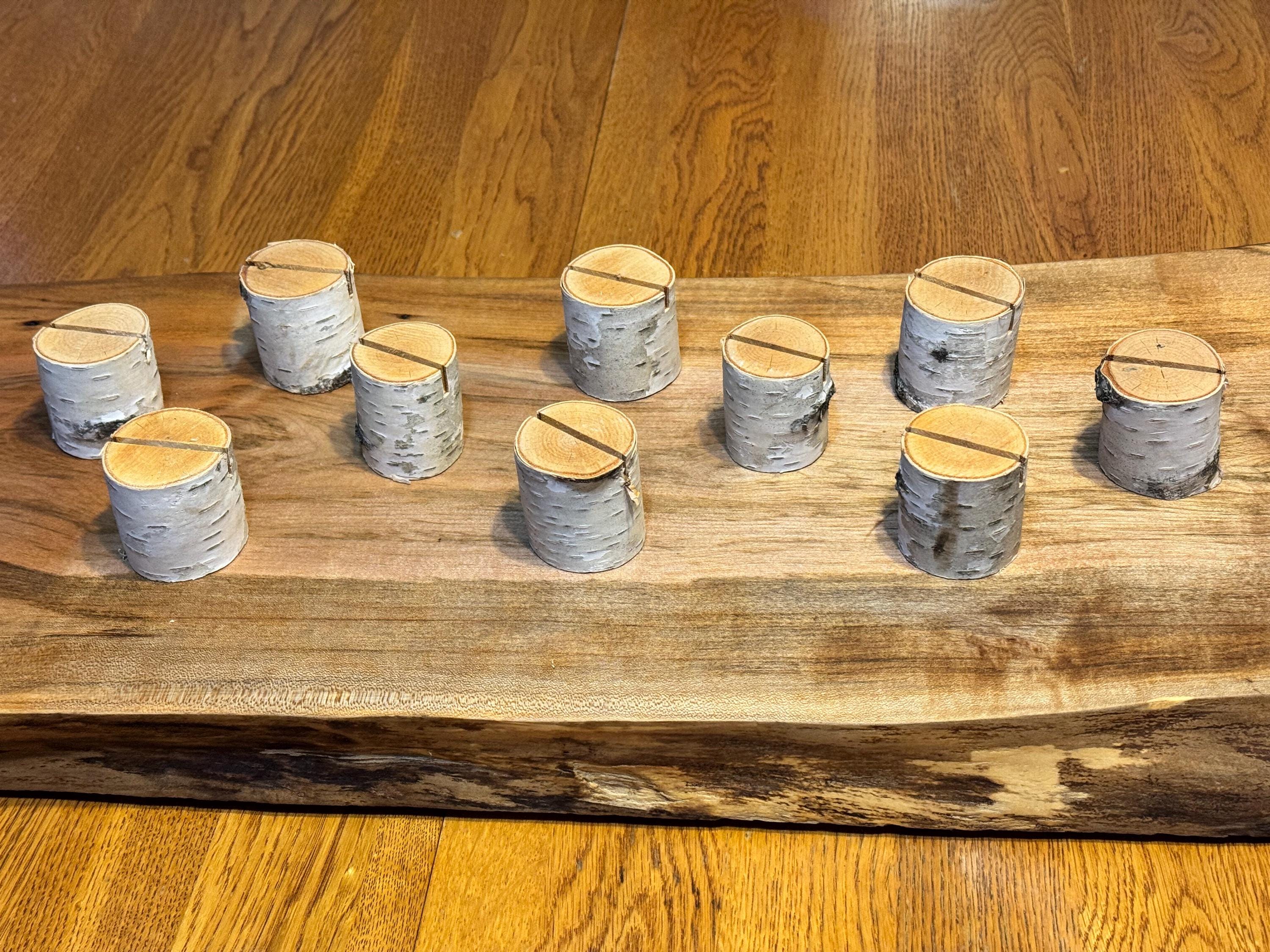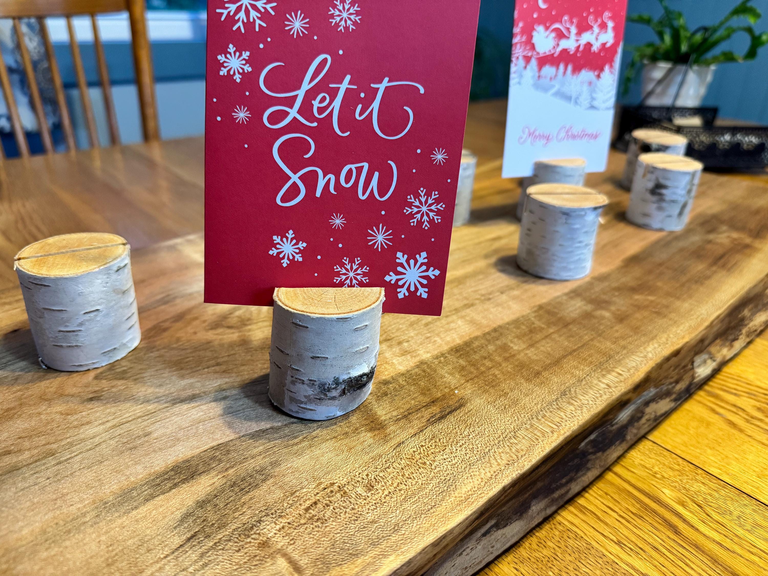 Bring a touch of rustic charm to your table with this set of handcrafted white birch place card holders. Each piece is cut from sustainably sourced Maine birch and measures approximately 2 inches by 2 inches—perfectly sized to hold name cards, table numbers, or small photos. The wood is kiln-dried to eliminate moisture and prevent insects from hiding under the bark, ensuring a clean and safe addition to your décor. The natural bark and smooth top surface highlight the wood’s organic beauty, making them ideal for weddings, holiday gatherings, or cozy cabin settings. Sold in sets of 10 with free shipping.